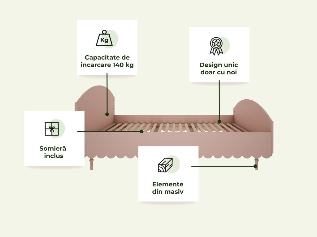 Pentru pat recomandam salteaua pentru copii METROPOLIS cu miez solid. Salteaua este potrivita si daca uneori adormi impreuna cu copilul tau.