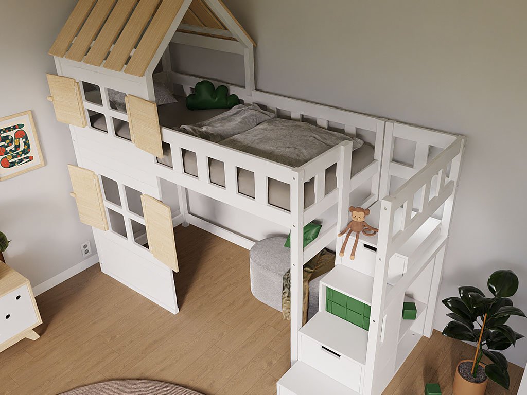 Pat înalt CĂSUȚA cu acoperis partial si trepte de depozitare 90x200 cm