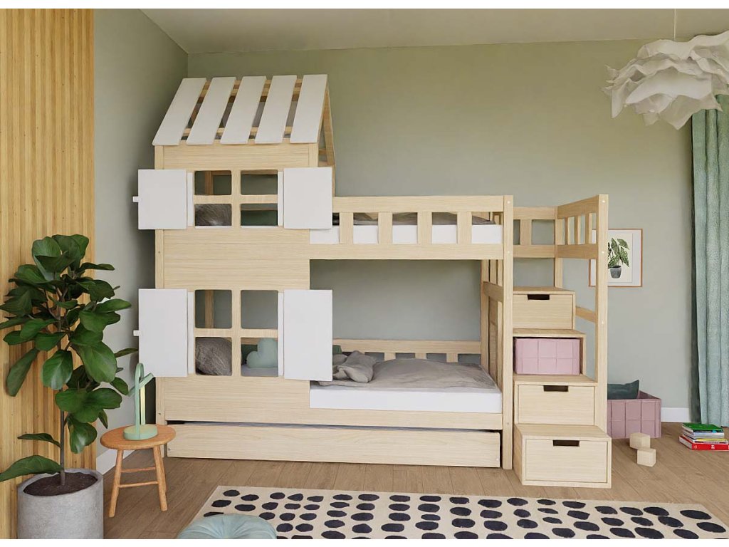 Pat supraetajat CĂSUȚA cu acoperiș parțial și trepte cu spațiu de depozitare 90x200 cm