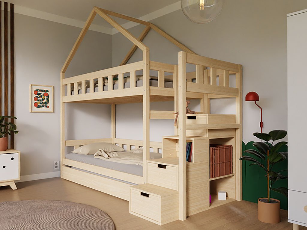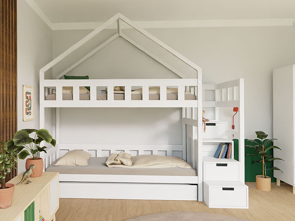 Pat supraetajat tip căsută PLOTTY cu trepte de depozitare 90x200 cm
